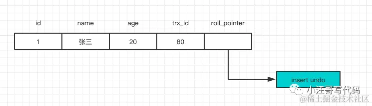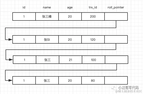 每次对记录进行改动,都会记录一条undo日志,每条undo日志也都有一个roll_pointer属性 (INSERT操作对应的undo日志没有该属性,因为该记录并没有更早的版本),可以将这些undo日志都连起来,串成一个链表,所以现在的情况就像下图一样: