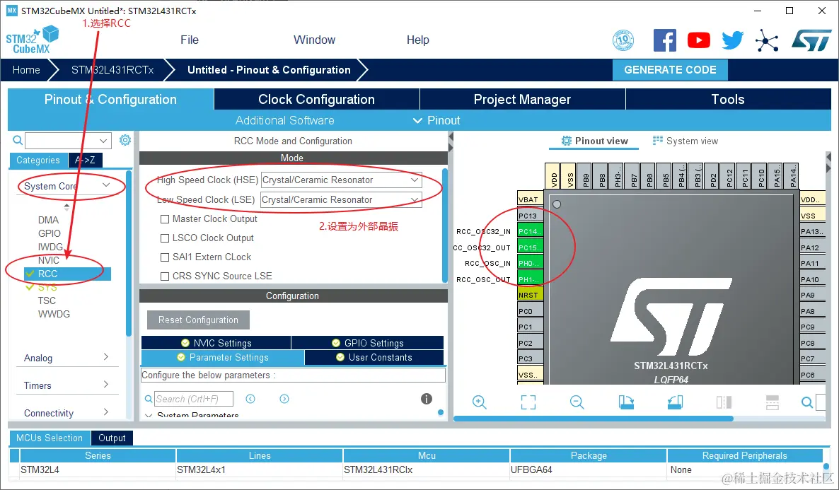 - 如果选择使用外部高速时钟(HSE),则需要在System Core中配置RCC;