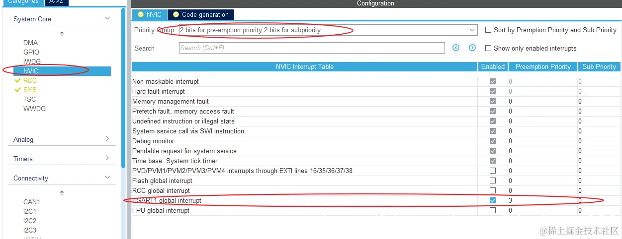 在NVIC中配置USART中断优先级: