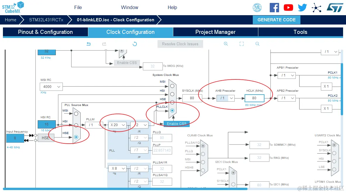 STM32L4的最高主频到80M,所以配置PLL,最后使HCLK = 80Mhz即可: