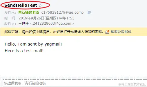 yag.send(to = '2412828003@qq.com', subject = 'SendHelloTest', contents = contents)