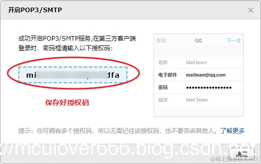 接下来QQ邮箱会给出授权码,一定要保存好: