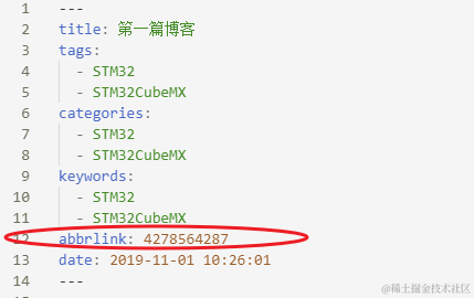 使用hexo clean && hexo g重新生成博客,在博客源文件可以看到自动生成的abbrlink编号: