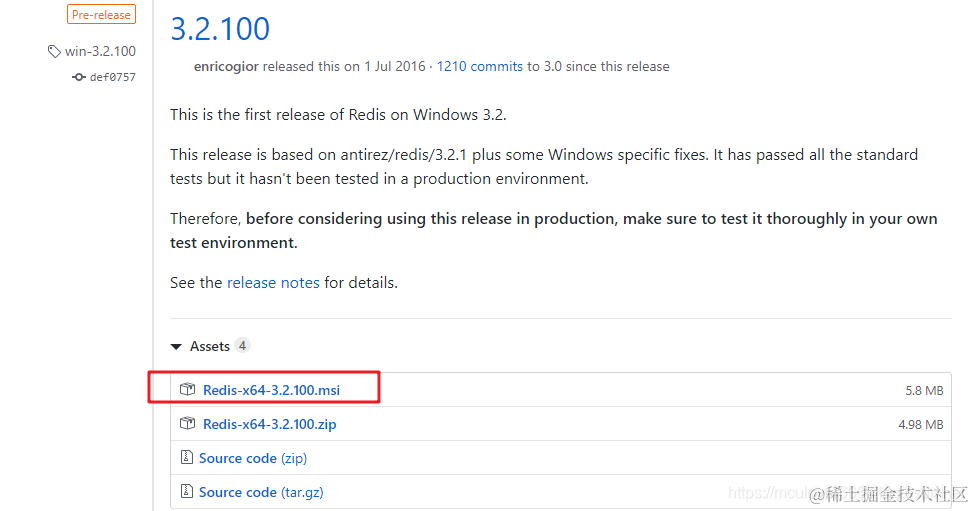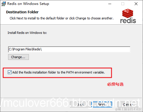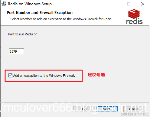 Redis 3.2安装过程(win10) mculover666 2021-06-10 203 阅读1分钟 1. 下载 github.com/MSOpenTech/… 2. 安装 双击运行下载的msi程序开始安装: 勾选上则向Windows防火墙添加一个异常,允许监听该端口,否则需要手动关闭防火墙: 安装完成后,服务会自动启动。 3. 测试 打开cmd命令行,连接redis服务: redis-cli.exe -h 127.0.0.1 -p 6379 可以看到连接成功。 至此,redis安装成功!