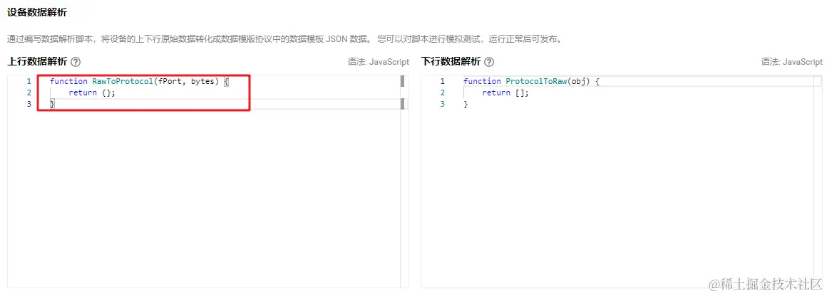 上行数据解析的脚本主函数为 RawToProtocol,其带有 fPort、bytes 两个入参: