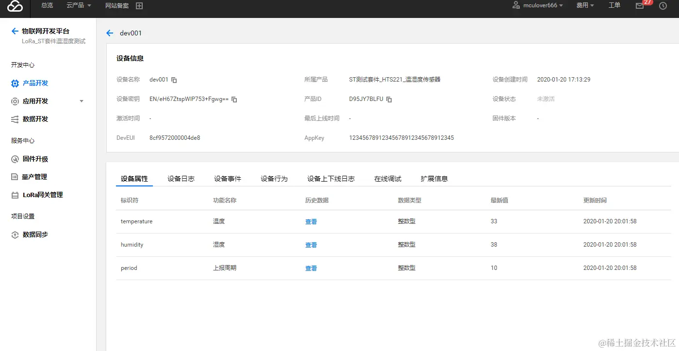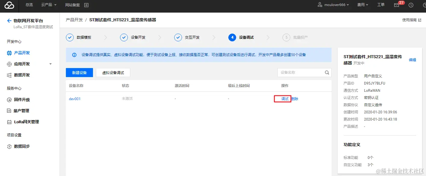保持 LoRa 节点和 LoRa 网关 为运行状态,进入【控制台】>【产品开发】>【设备调试】,可查看到设备 “dev001” ,单击【调试】,可进入设备详情页: