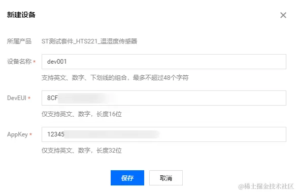 在设备调试页面中,单击【新建设备】,设备名为 dev001,DevEUI 等信息可从 LoRa 节点开发板背面贴纸上获取: