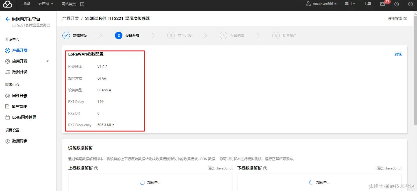 在设备开发页面中,按需调整设备数据解析。由于 LoRa 类资源有限设备不适合直接传输 JSON 格式数据,使用“设备数据解析”可以将设备原始数据转化为产品 JSON 数据。