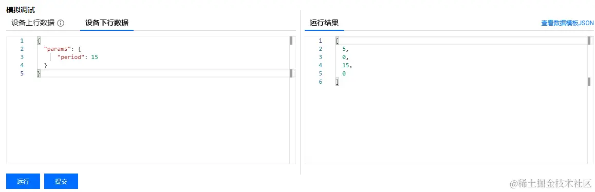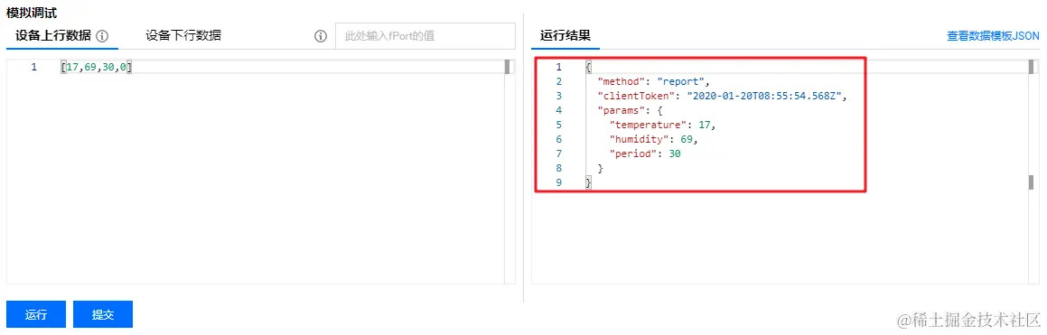 上行模拟数据为:[17,69,30,0],填入设备上行数据的编辑框中,单击【运行】,即可在模拟调试界面右侧查看结果: