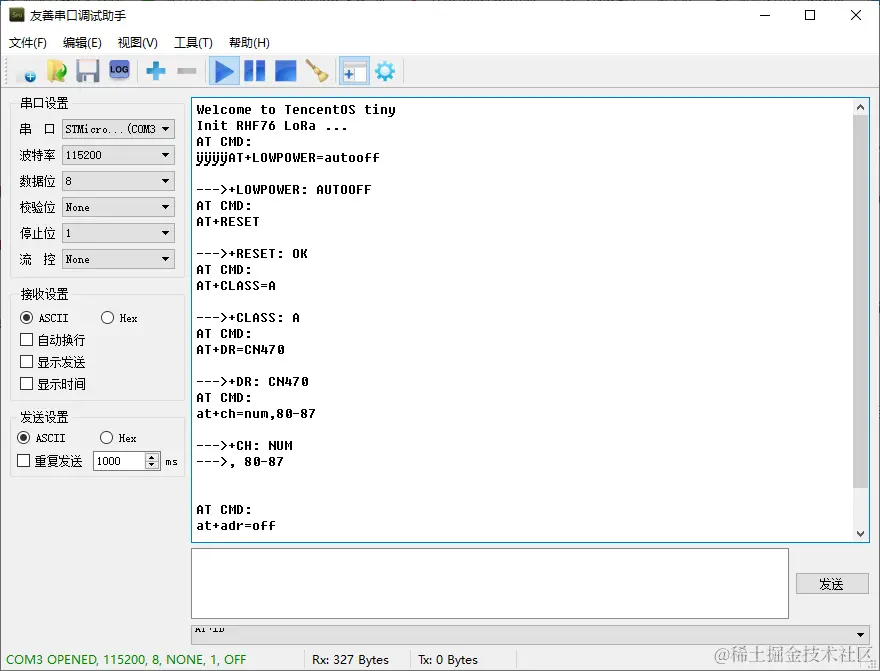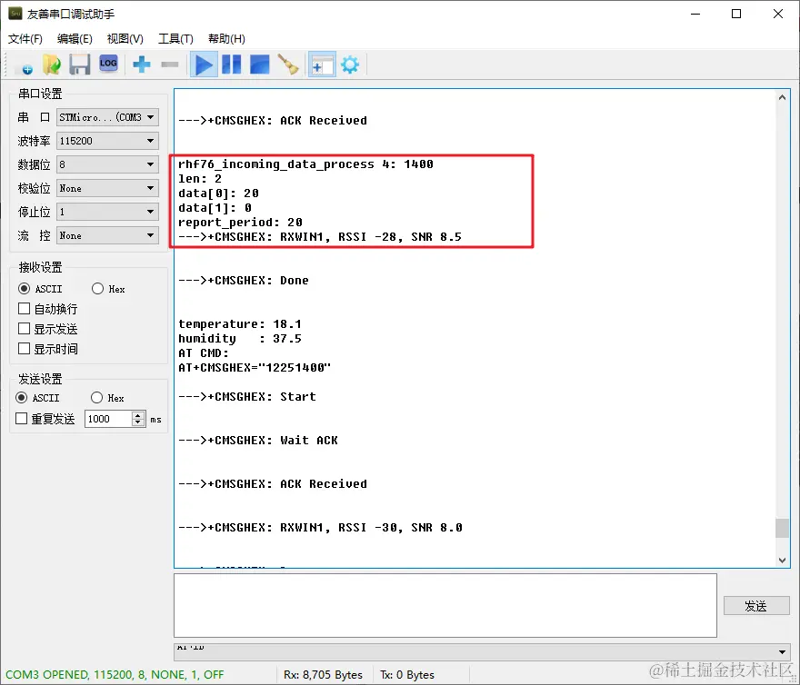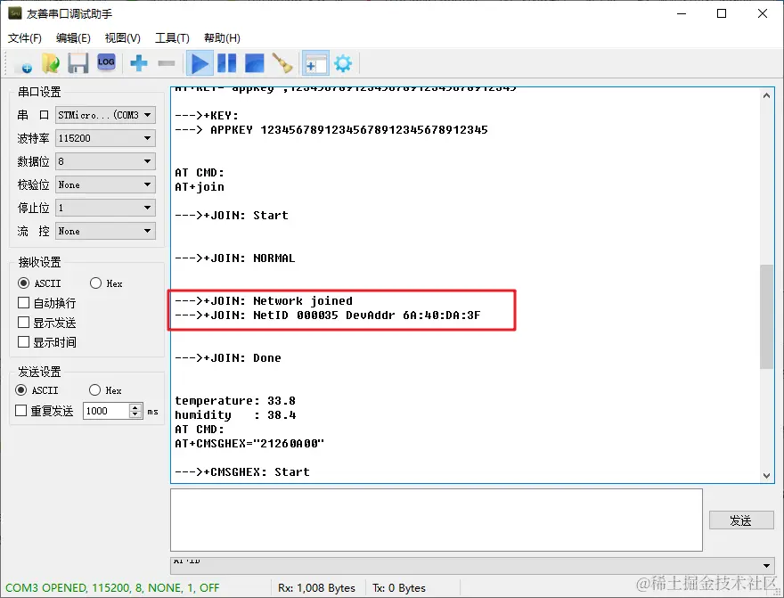 当看到串口打印如下日志,即说明 LoRa 节点已经通过网关成功入网: