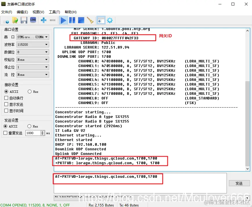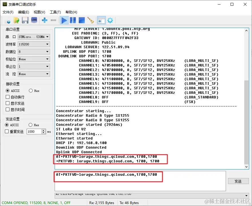 腾讯云物联网开发平台的 LoRa 服务器地址(接入域名:loragw.things.qcloud.com,接入端口:1700),命令如下: