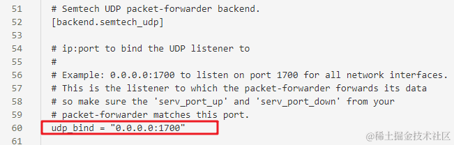 在该文件中可供用户自行配置的选项只有一个——网关对接服务器使用的UDP端口,可以看到默认是1700,这里保持不变即可,如有特殊需求请自行修改: