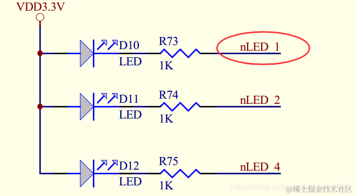 原理图中表示了芯片控制LED的硬件电路以及芯片的引脚与LED如何连接。