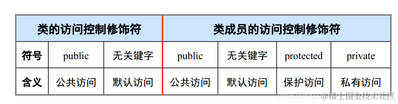- 访问控制符加在类定义、类的属性定义、类的方法定义之前,用于修饰其访问权限,如果不加则为默认。