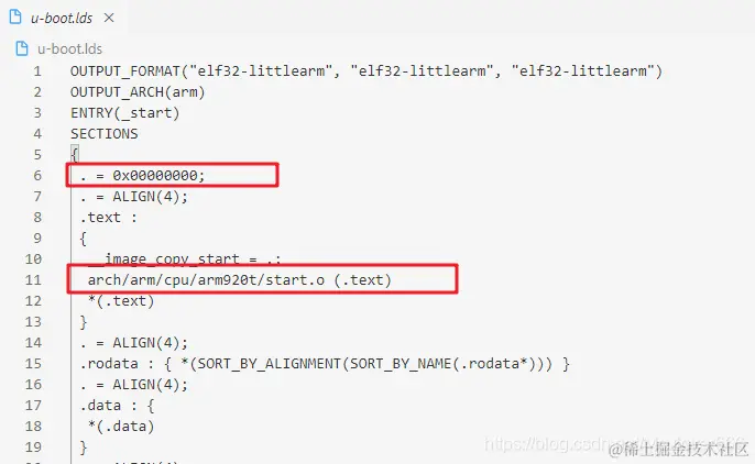 在编译产生的链接文件uboot.lds中可以看到,0地址处存放的是arch/arm/cpu/arm920t/start.S文件编译产生的内容: