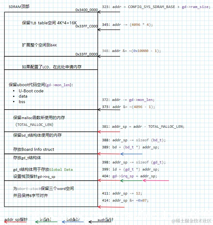 - 设置好栈顶指针sp,调用C程序中的board_init_f 函数