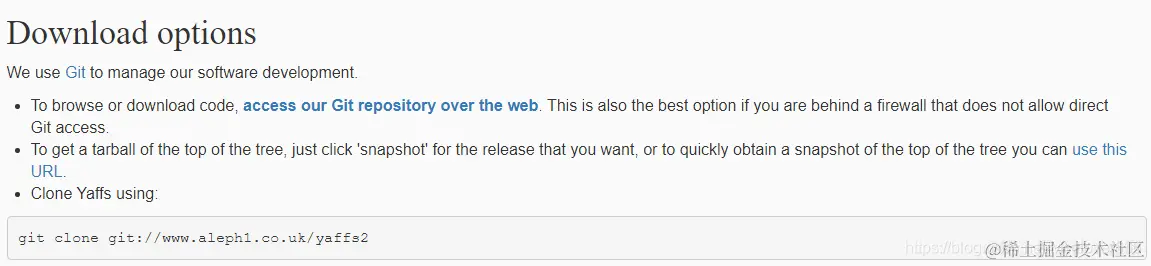 访问yaffs官网:yaffs.net,进入下载页面即可看到,可以使用git直接拉取: