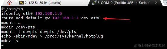 设置开机后自动设置网关ip,在开发板上使用vi编辑器编辑etc/init.d/rcS文件,添加一条配置命令即可: