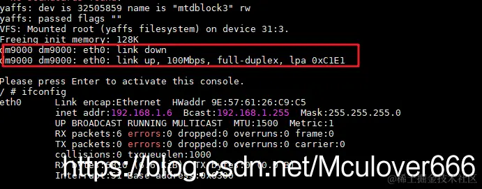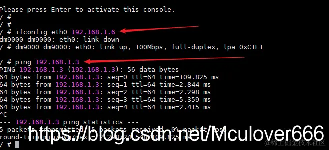 编译完成之后烧写到开发板中,进入到Linux系统后进行网络测试: