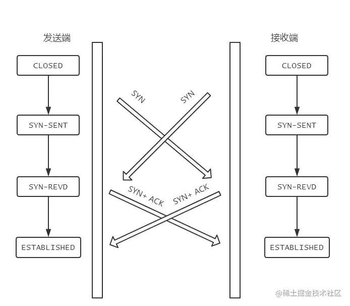 在发送方给接收方发SYN报文的同时,接收方也给发送方发SYN报文,两个人刚上了!