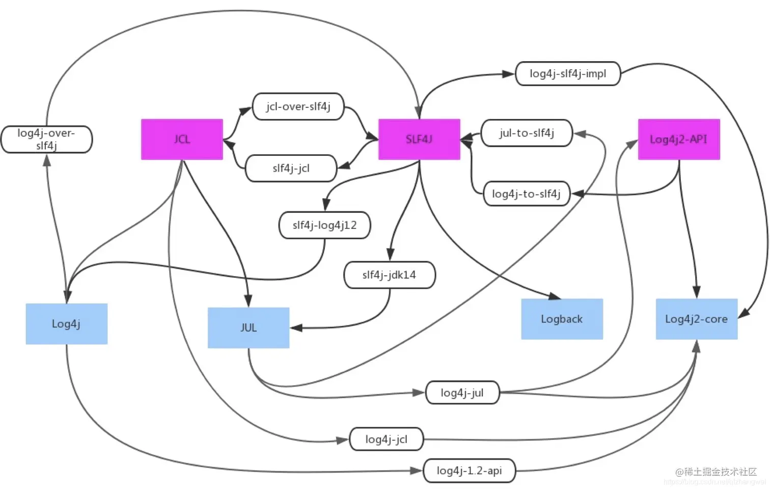 如:tomcat 和 springboot 分别使用了不同的日志实现