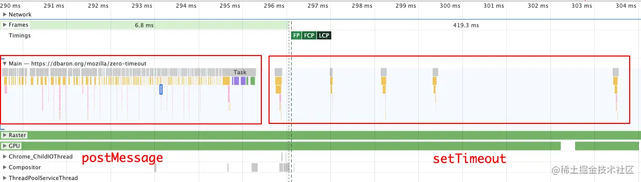 只是看冷冰冰的数字还不够过瘾,我们打开 Performance 面板,看看更直观的可视化界面中,postMessage版的定时器和setTimeout版的定时器是如何分布的。