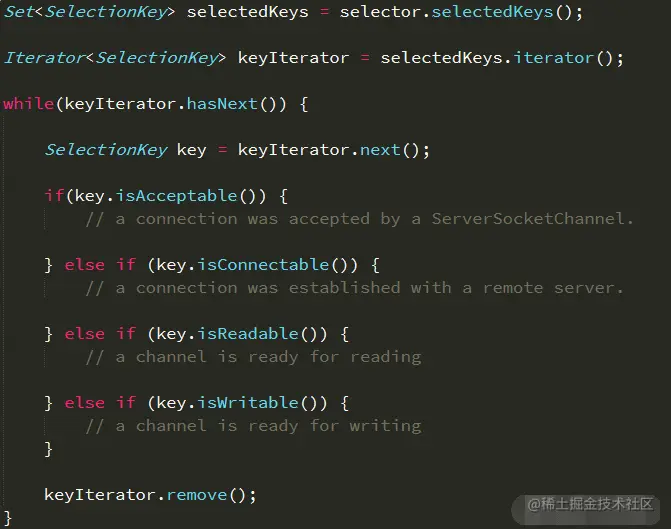 要使用Selector,得向Selector注册Channel,然后调用它的select()方法。这个方法会一直阻塞到某个注册的通道有事件就绪。一旦这个方法返回,线程就可以处理这些事件,事件的例子有如新连接进来,数据接收等。