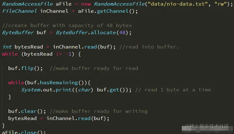 Channel和Buffer使用案例:改代码以随机读写方式打开nio-data.txt文件,一个字节一个字节的把文件内容读入新分配的buf缓存中。