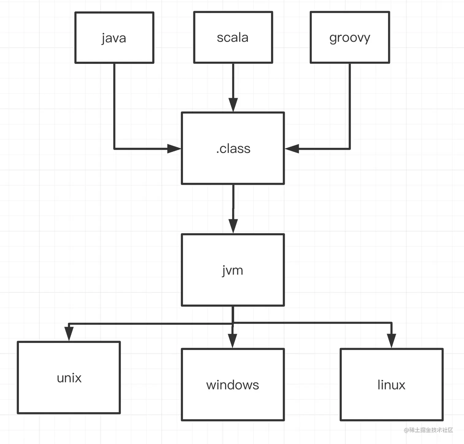 而java代码是更高的一层抽象,这一层屏蔽语言本身。类似于scala,groove,kotlin都可以运行在jvm上,这就是屏蔽了语言的好处。