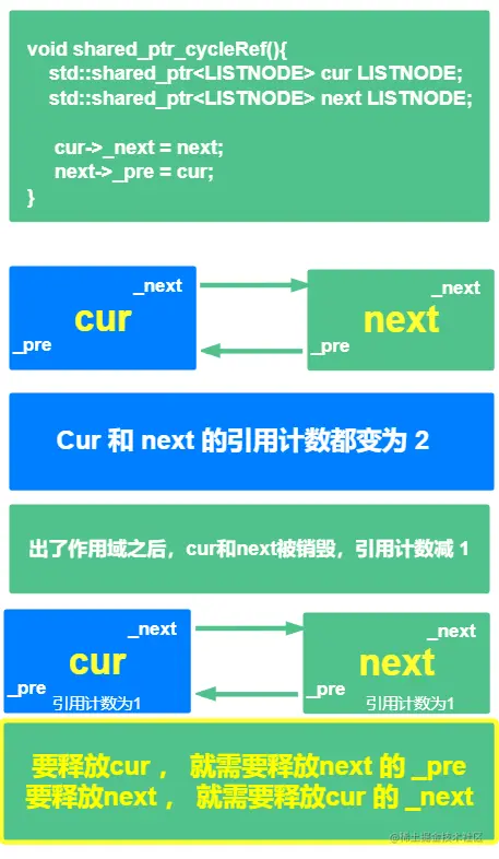 共享的智能指针,shared_ptr使用引用计数(use_count方法),每个shared_ptr的拷贝都指向同一块内存,在最后一个shared_ptr被析构的时候,内存才会被释放