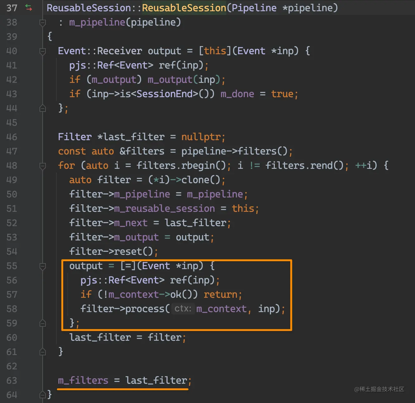 为什么只有一个 Filter?重点来了,看下 ReusableSession 的构造过程就能明白了(这里用了个反向迭代器)。output 是当前 Filter 处理完要执行的,实现类似链式的执行。