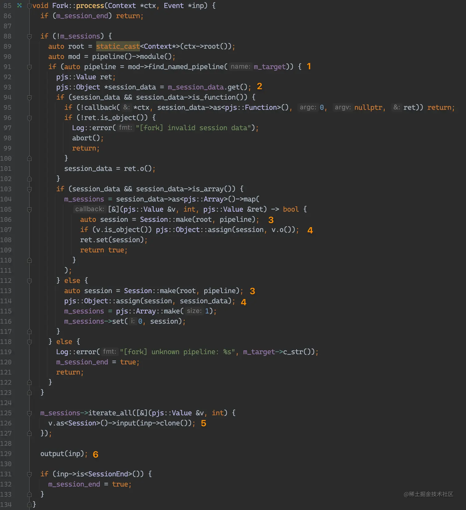 src/filters/fork.cpp:85,在 fork 过滤器中,在 1 处从 module 中获取到目标 Pipeline,并在 3 和 4 处 创建了新的 Session 并保存原 Session 的数据。