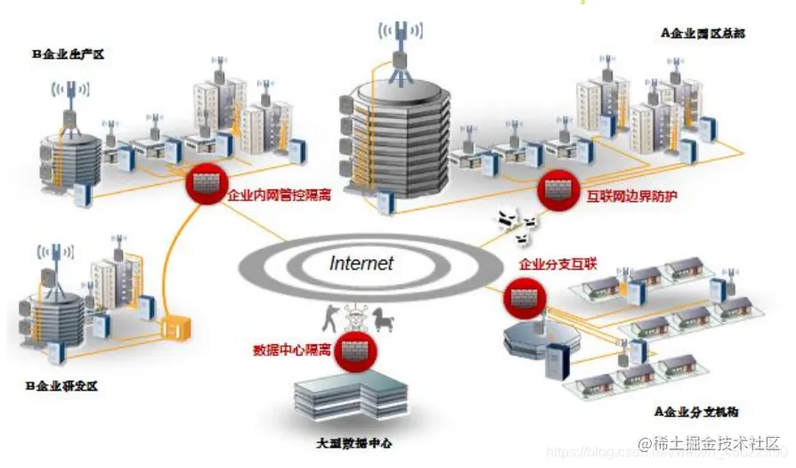 那么,用通信语言来定义,防火墙主要用于保护一个网络免受来自另一个网络的攻击和入侵行为。因其隔离、防守的属性,防火墙灵活应用于网络边界、子网隔离等位置,如企业网络出口、大型网络内部子网隔离、数据中心边界等,如图所示。