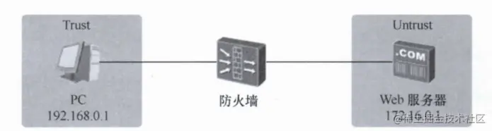 PC和Web服务器位于不同的网络,分别与防火墙相连,PC与Web服务器之间的通信受到防火墙的控制。