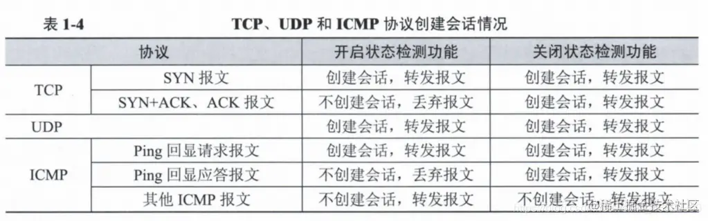 判断一个TCP连接的主要标志就是SYN报文,我们也把SYN报文称为TCP****连接的首包。对于TCP协议,防火墙只有收到SYN报文并且配置的规则允许SYN报文通过才会建立会话,后续的TCP报文匹配会话直接转发。如果防火墙没有收到SYN报文,只收到了SYN+ACK或ACK等后续报文,是不会创建会话的,并且会将这些报文丢弃。