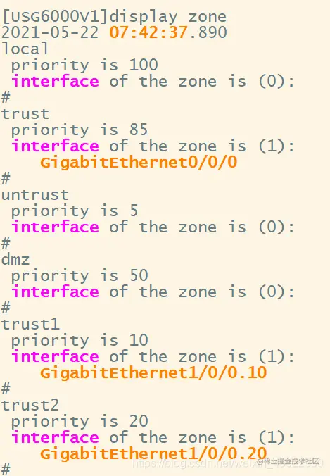 此时,我们可以使用display zone命令来查看防火墙上安全区域的配置情况以及接口加入安全区域的情况,检查我们用到的接口是否加入安全区域。