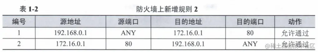 配置了这条规则后,PC发出的报文就可以顺利通过防火墙,到达Web服务器。然后Web服务器将会向PC发送回应报文,这个报文也要穿过防火墙才能到达PC。在状态检测防火墙出现之前,包过滤防火墙上还必须配置表所示的编号为2的规则,允许反方向的报文通过。