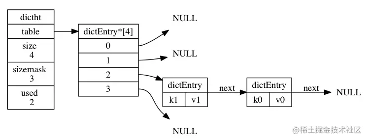 table是一个指针数组,他里面的每个元素都指向一个哈希表节点dictEntry。