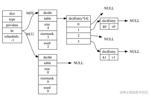 - 当我们的ht[0]上的所有键值对都迁移到ht[1]之后ht[0]是空表了,此时将ht[0]指向ht[1] ht[1]指向null 至此我们的rehash就完成了。