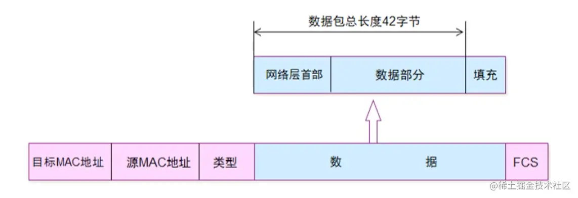 当数据部分(从网络层传入的数据)的长度小于46字节时,数据链路层会在数据的后面加入一些字节填充,接收端会将添加的字节去掉。