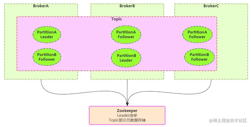 其中集群的中Leader的监控和Topic的部分元数据是存储在Zookeeper中。