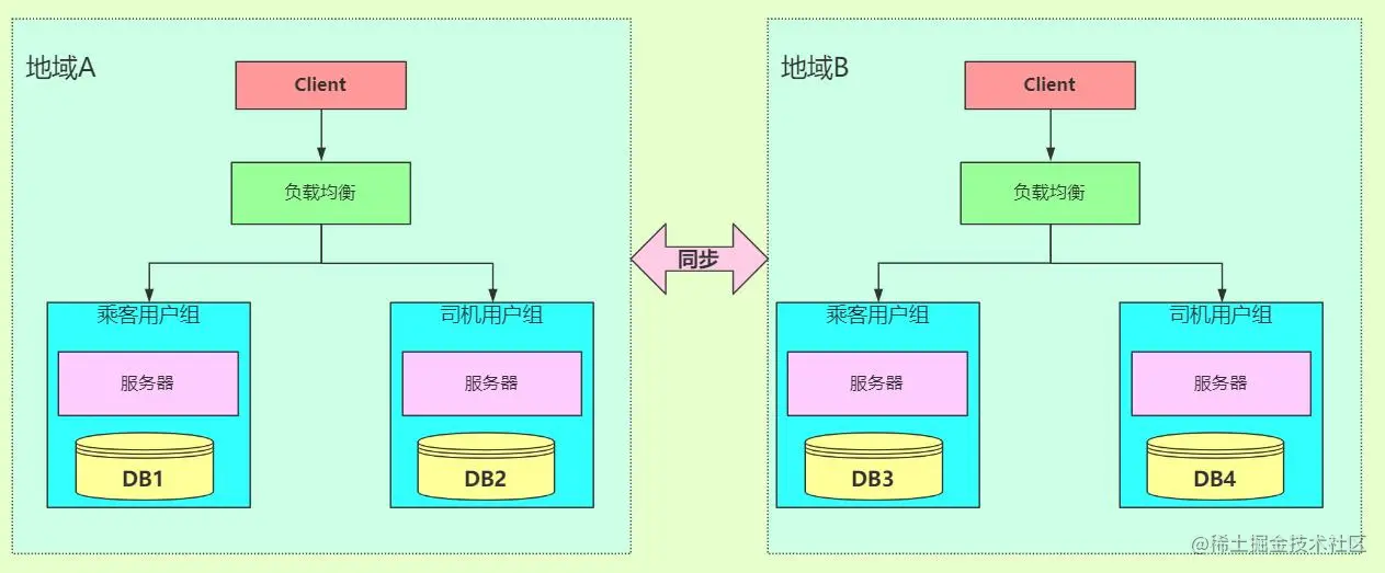 下图中,使用了 2 种 Z 轴扩展系统的方式。首先是基于客户端的地理位置,选择不同的 IDC 就近提供服务。其次是将不同的用户分组,比如乘客用户组与司机用户组,这样在业务上分离用户群体后,还可以有针对性地提供不同服务。