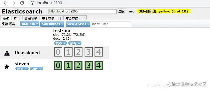 然后浏览器中访问localhost:9100,即可看到如下页面和数据库信息,然后就可以通过head插件实现ES的增删改查功能