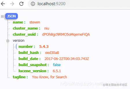 浏览器输入 localhost:9200/ 出现一下界面,ElasticSearch 我们已经成功安装了