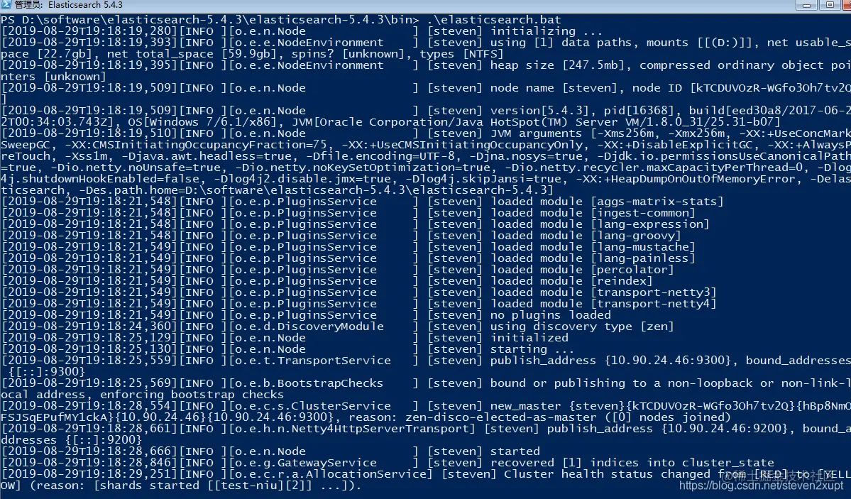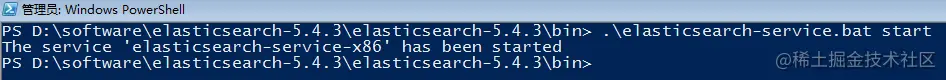 解压至本地,进入bin 目录,运行 elasticsearch.bat,最好用windows自带的powershell执行: