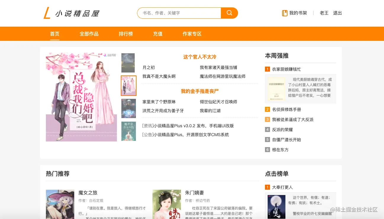今天小编推荐一个多端(PC、WAP)阅读、功能完善的原创文学CMS系统,由前台门户系统、作家后台管理系统、平台后台管理系统、爬虫管理系统等多个子系统构成,支持多模版、会员充值、订阅模式、新闻发布和实时统计报表等功能,新书自动入库,老书自动更新。