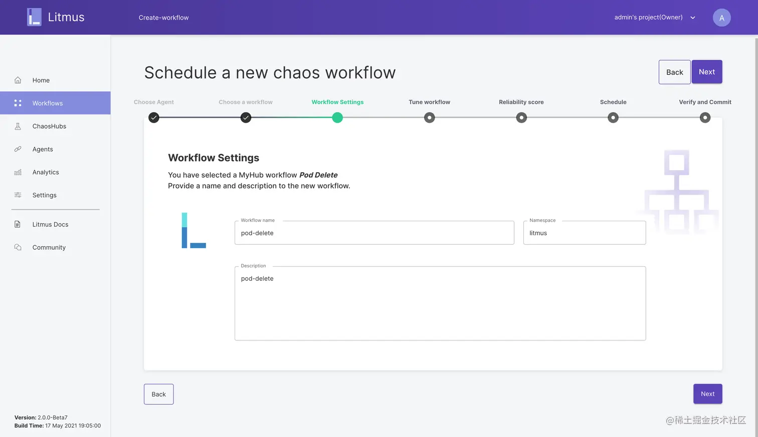 Litmus WebUI 提供了 Web 用户界面,用户可以在这里轻松构建和观察混沌实验工作流。Litmus WebUI 也充当了跨云混沌实验控制平面。