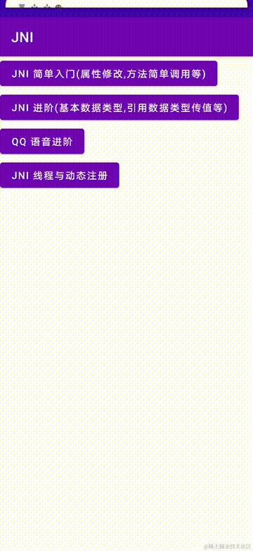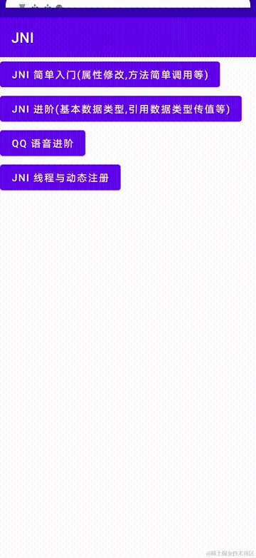 同理,如果你想看 JNI 基本使用(native-simple-lib.cpp)的代码,那么吧 JNI 进阶和 QQ语音实战的代码注释掉!