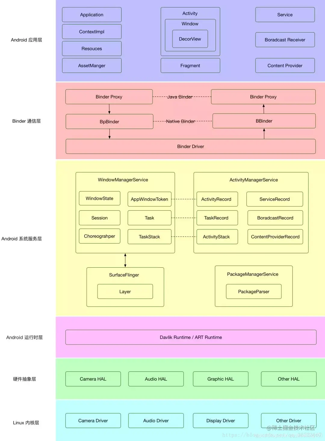 - HAL (新的 Android 架构图细化特定分出一个:Hardware Abstraction Lay (HAL)层)