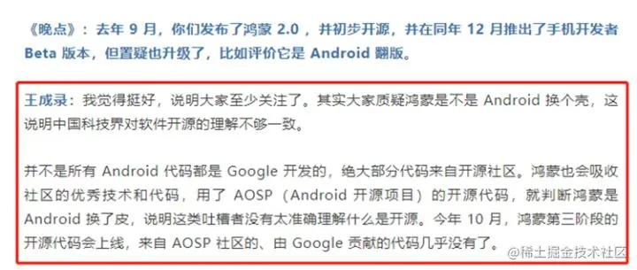 其实在此前华为消费者业务软件部总裁、鸿蒙操作系统负责人王成录在接受国内媒体采访时表示,大家质疑鸿蒙是不是Android换个壳,这说明中国科技界对软件开源的理解不够一致,并不是所有Android代码都是谷歌开发的,绝大部分代码来自开源社区。